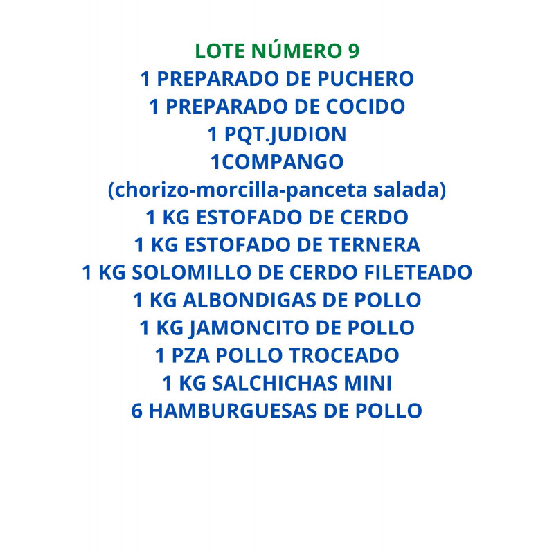 1 Preparado de puchero+ 1 Preparado cocido+ 1 Pza. Pollo troceado+ 1 kg Pechuga fileteada+ 1 kg Jamoncito de pollo+ 1 kg Filete de cinta de lomo fileteada+ 1 kg paleta troceada de cerdo+ 1 kg Croquetas de Puchero+ 1 kg Lagrimitas de pollo