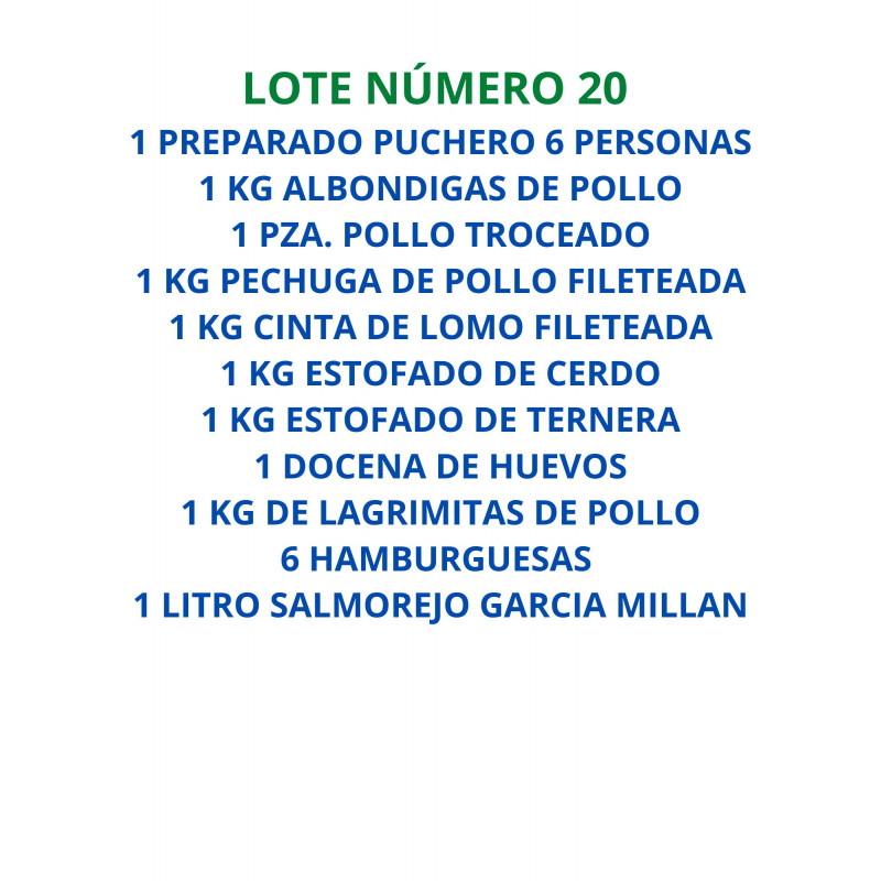 1 Preparado de puchero+1 kg de albóndigas+1 pza. pollo troceado+1 kg pechuga de pollo fileteada+1 kg cinta de lomo fileteada+1 kkg estofado de ternera+1 kg estofado de cerdo+1 docena de huevos+1 kg de lagrimitas de pollo+6 hamburguesas+21 litro salmorejo García Millán