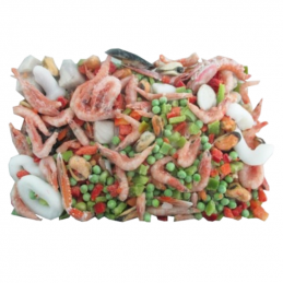 Ingredientes:Verduras (33%) (guisante, dados de pimiento verde y rojo), Almeja entera (20%) , langostino y/o Gamba, anilla de Pota, vianda de Mejillón, Dados de Pota argentina , Mejillón media concha y Cigala