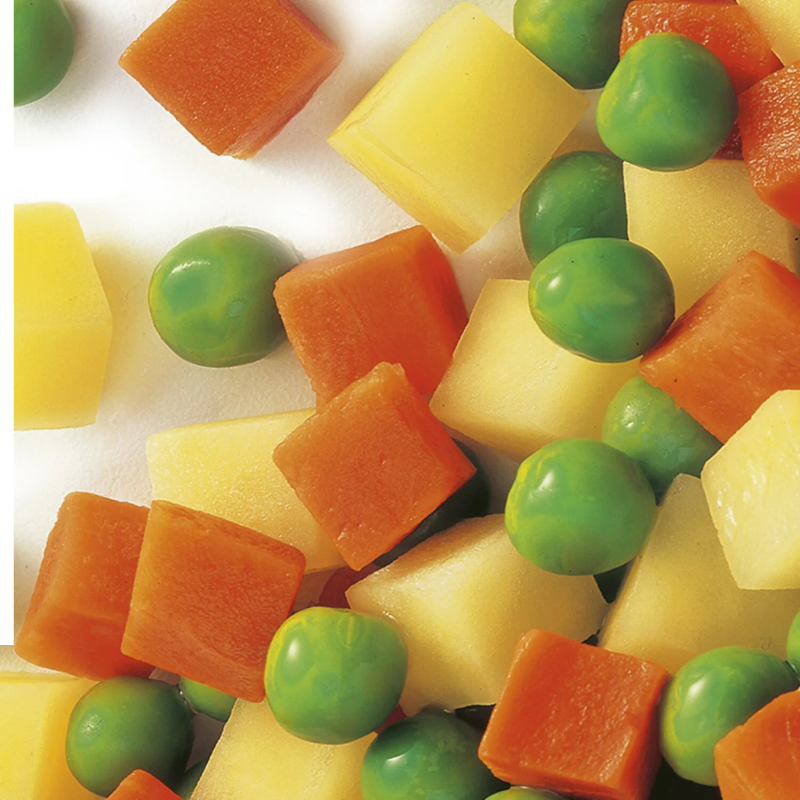 patatas en cubitos, zanahoria en cubitos, guisantes (en proporciones variables)