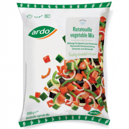 Tomate en cubitos ca.38%, calabacín cubos ca.20%, berenjena cubos ca.20%, cebolla rodajas ca.10%, pimiento rojo tiras ca.6%, pimiento verde tiras ca.6%