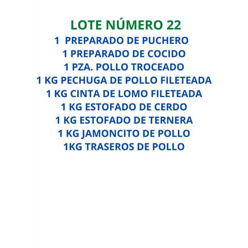 1 kg de Albóndigas+1 pza. pollo troceado+1 kg pechuga de pollo fileteada+1 kg filete de ternera+1 kg estofado de ternera+1 kg cinta de lomo fileteada+1 kg estofado de cerdo+ 6 hamburguesas de pollo+1 kg croquetas de puchero+1 kg de lagrimitas de pollo+ 1kg salchichas mini