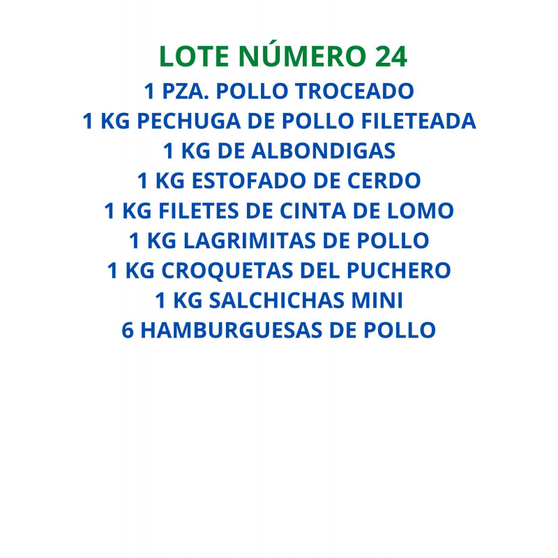 1 Pza. pollo troceado+1 kg pechuga de pollo fileteada+1kg de albóndigas+1kg estofado de cerdo+1 kg filete de cinta de lomo+1 kg lagrimitas de pollo+1 kg croquetas de puchero+1 kg salchichas mini+6 hamburguesas de pollo