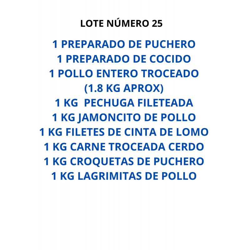 1 Preparado de puchero+1 preparado de cocido+1 paquete de judion+1 compango (chorizo,morcilla,panceta salada)+1kg estofado de cerdo+1 kg estofado de ternera+1 kg solomillo de cerdo fileteado+1 kg albóndigas de pollo+1 kg jamoncito de pollo+1pza. pollo troceado+1 kg salchichas mini+6 hamburguesas