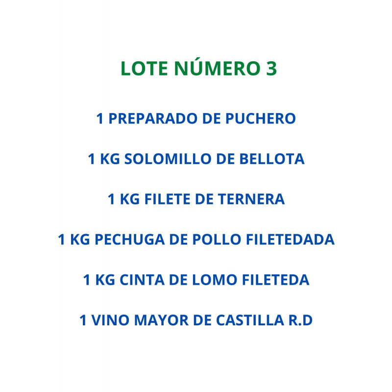 1 Preparado de puchero+1 kg solomillo de bellota+1 kg filete de ternera+1 kg pechuga de pollo fileteada+1 kg cinta de lomo fileteada+1 botella vino Mayor de Castilla