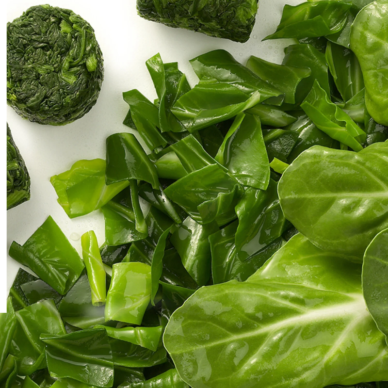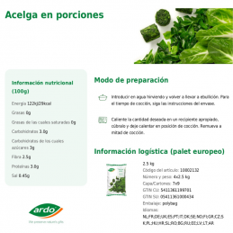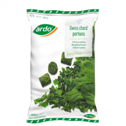 Hojas tiernas de acelgas (Beta vulgaris L.cv. cicla L.) procedentes de materia prima fresca y sana. Las hojas se limpian en seco en un separador de aire y un tambor de insectos, se lavan, se escaldan, se enfrían y se cortan en porciones de 50 g aprox. (porciones prensadas rectangulares: 60x40x25mm) que se ultracongelan individualmente.