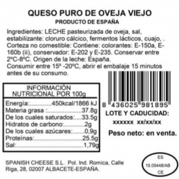 17.29 €/Kg IVA INCLUIDO Unidad de venta: Medio queso Precio aproximado de Venta: Medio queso Peso aproximado la pieza 1.5 kg Leche: Oveja